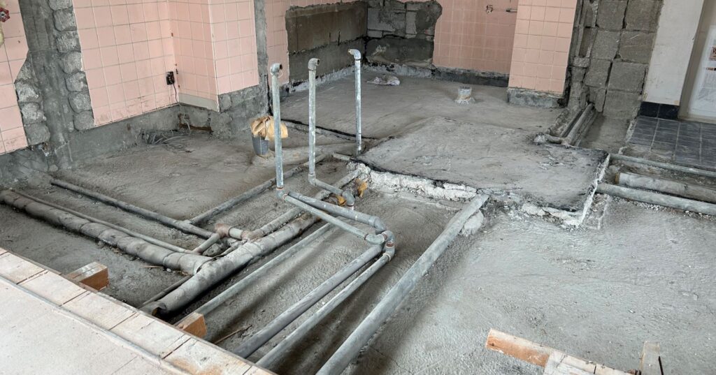 床や壁を解体すると、多数の配管が出現。