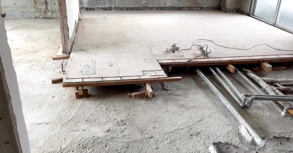 今回のように、骨組みだけを残して内装をすべて一新する「スケルトンリノベーション」では、既存の壁・床・天井・配管などを、丁寧に取り除いていきます。